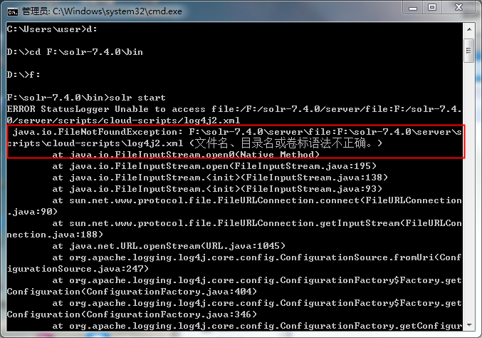 在启动的时候如果打印java异常堆栈log4j2.xml 文件名、目录名或卷标语法不正确,原因: log4j的bug, solr.cmd 批处理没弄好。如下图