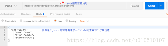 Schema API其实就是用post请求向solr服务器发送携带json参数的请求,所有操作内容都封装在json中,如果是linux系统直接使用curl工具,如果是windows系统推荐使用Postman
