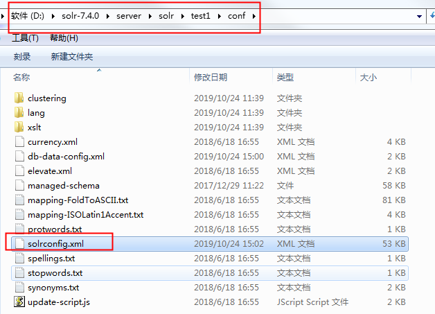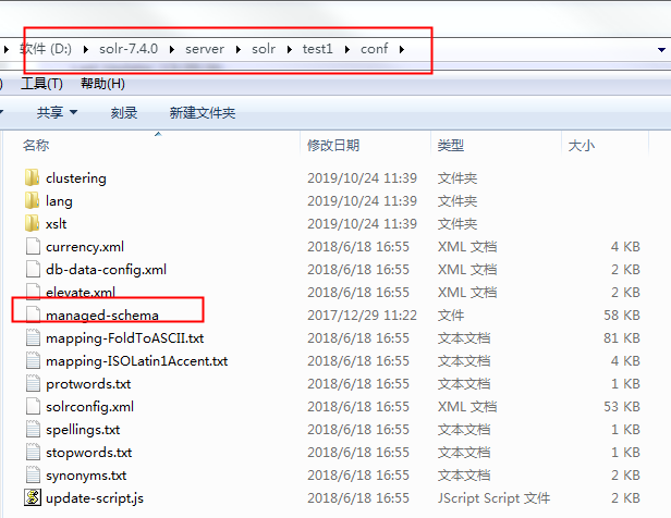 managed-schema是用来告诉solr如何建立索引的,他的配置围绕着一个managed-schema配置文件,这个配置文件决定着solr如何建立索引,每个字段的数据类型,分词方式等,老版本的schema配置文件的名字叫做schema.xml他的配置方式就是手工编辑,但是现在新版本的schema配置文件的名字叫做managed-schema,他的配置方式不再是用手工编辑而是使用schemaAPI来配置,官方给出的解释是使用schemaAPI修改managed-schema内容后不需要重新加载core或者重启solr更适合在生产环境下维护,如果使用手工编辑的方式更改配置不进行重加载core有可能会造成配置丢失,managed-schema所在目录为 D:\solr-7.4.0\server\solr\test1\conf,如下图: