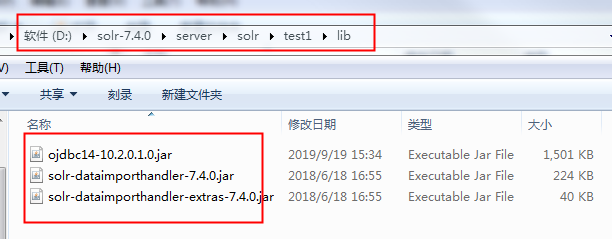 在创建的core目录下(D:\solr-7.4.0\server\solr\test1)创建 lib 文件夹,将数据库驱动jar包复制进去。在D:\soft\solr-7.4.0\dist文件夹下的solr-dataimporthandler-4.5.1.jar和solr-dataimporthandler-extras-4.5.1.jar也复制进去(这2个jar不一定需要复制,跟进启动后看日志是否报 没有这个类 org.apache.solr.handler.dataimport.DataImportHandler,报了就复制进去)