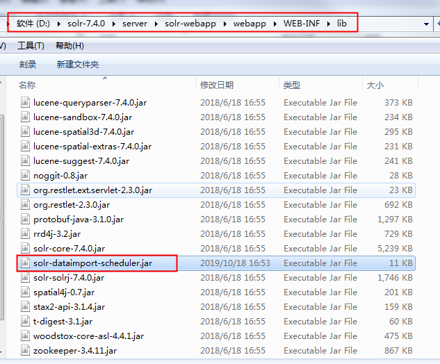 下载 solr-dataimport-scheduler.jar 将其复制到 D:\solr-7.4.0\server\solr-webapp\webapp\WEB-INF\lib 下,如下图: