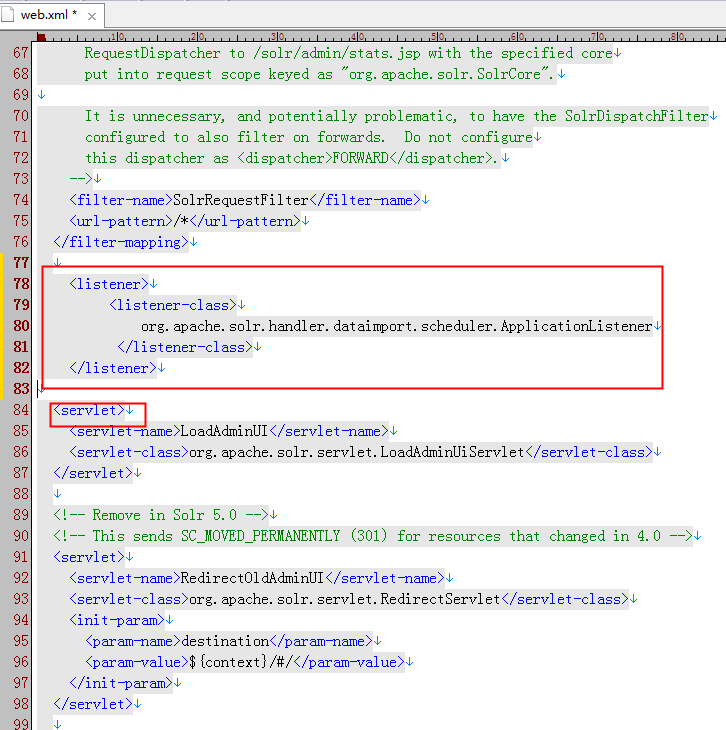 找到web.xml (D:\solr-7.4.0\server\solr-webapp\webapp\WEB-INF)在第一个servlet标签添加