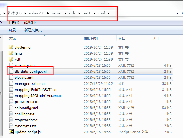 在自己创建的core目录下conf目录下(比如:D:\solr-7.4.0\server\solr\test1\conf)有个 db-data-config.xml 文件( 如何目录下没有改文件可以到D:\solr-7.4.0\example\example-DIH\solr\db\conf 目下拷贝到自己的目录下),用于连接数据库抽取数据,如下图: