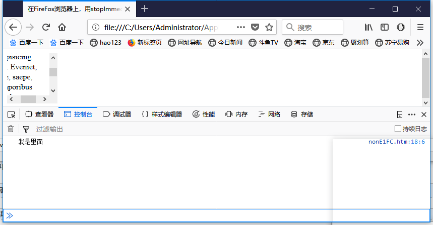 //不添加stopImmediatePropagation,如果我滚动鼠标,事件触发,控制台输出“我是里面”的字符,由于此节点的父节点也有相同事件类型的事件,并且符合触发条件,因此,打印输出“我是里面”后,也会打印输出“我是外面”,姑且称它为冒泡。为啥这样?此博不侧重讲这个问题,只注重讲解标题。