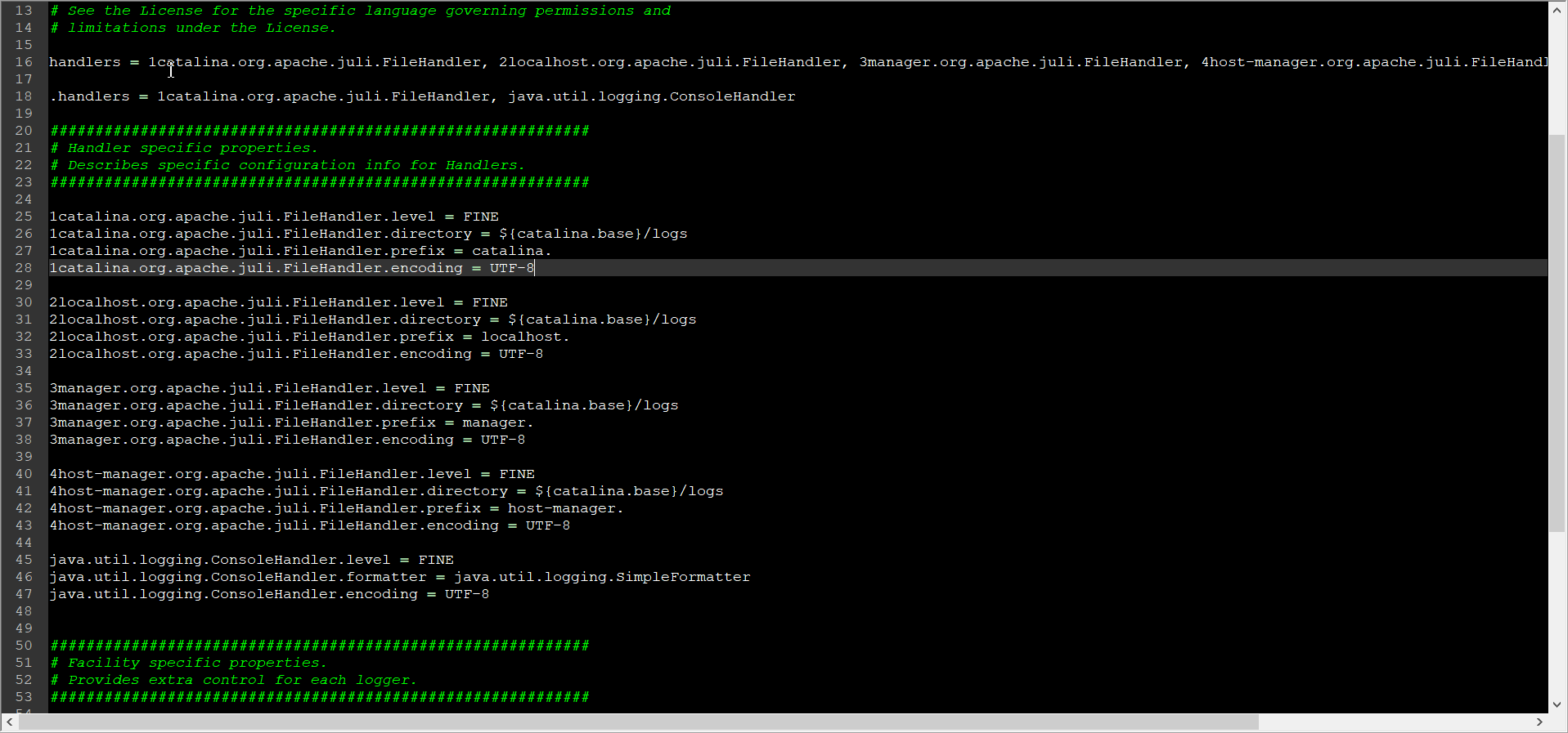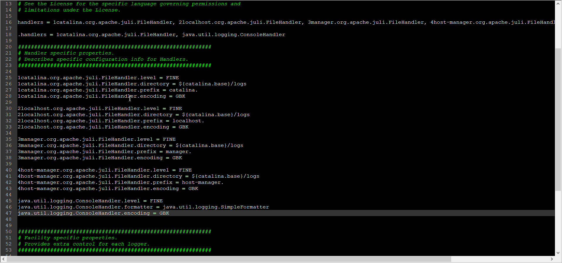 如果没有设置环境变量“%LOGGING_CONFIG%”值,则到Tomcat根目录下“conf”子目录下的“logging.properties”文件中查看日志记录的配置,找到该文件,可发现很多的“encoding = UTF-8”配置项,因此判断是该配置项影响了Tomcat控制台的中文乱码输出