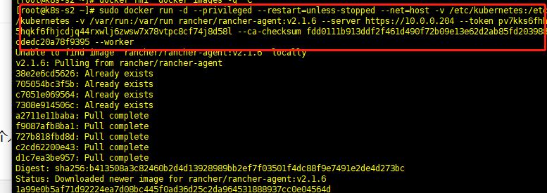 sudo docker run -d --privileged --restart=unless-stopped --net=host -v /etc/kubernetes:/etc/kubernetes -v /var/run:/var/run rancher/rancher-agent:v2.1.6 --server https://10.0.0.204 --token pv7kks6fhh5hqkf6fhjcdjq44rxwlj6zwsw7x78vtpc8cf74j8d58l --ca-checksum fdd0111b913ddf2f461d490f72b09e13e62d2ab85fd203988cdedc20a78f9395 --worker
