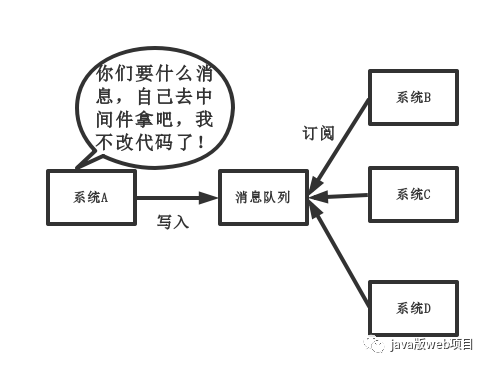 ● 将消息写入消息队列,需要消息的系统自己从消息队列中订阅,从而系统A不需要做任何修改。