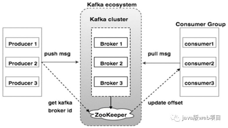 如上图所示,一个典型的Kafka集群中包含若干Producer(可以是web前端产生的Page View,或者是服务器日志,系统CPU、Memory等),若干broker(Kafka支持水平扩展,一般broker数量越多,集群吞吐率越高),若干Consumer Group,以及一个Zookeeper集群。Kafka通过Zookeeper管理集群配置,选举leader,以及在Consumer Group发生变化时进行rebalance。Producer使用push模式将消息发布到broker,Consumer使用pull模式从broker订阅并消费消息。