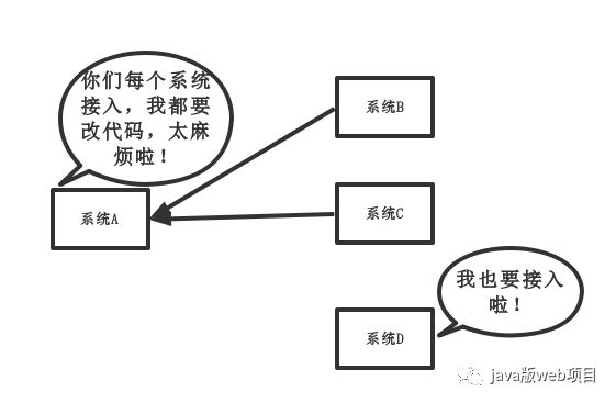 ● 系统间耦合性太强,如上图所示,系统A在代码中直接调用系统B和系统C的代码,如果将来D系统接入,系统A还需要修改代码,过于麻烦!
