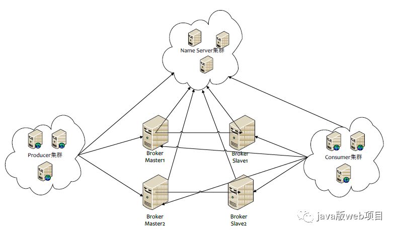 以rcoketMQ为例,他的集群就有多master 模式、多master多slave异步复制模式、多 master多slave同步双写模式。多master多slave模式部署架构图(网上找的,偷个懒,懒得画):