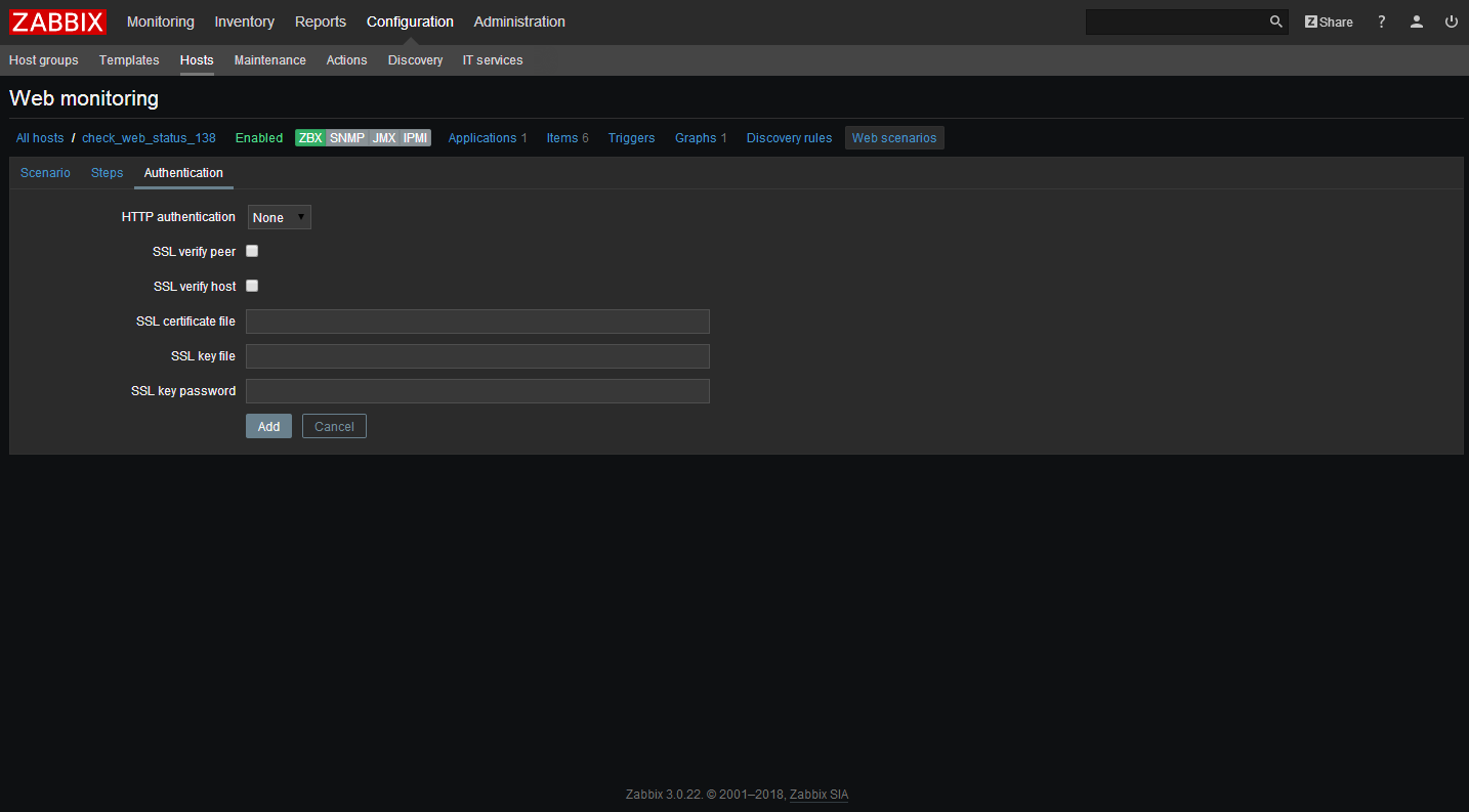| SSL 验证主机 (SSL verify host) | 选中复选框以验证 Web 服务器证书的 公用名称 (Common Name) 字段或 主题备用名称 (Subject Alternate Name) 字段是否匹配、\ 这将会设置 CURLOPT SSL VERIFYHOST cURL 参数。 Zabbix 2.4 开始支持此选项。 |