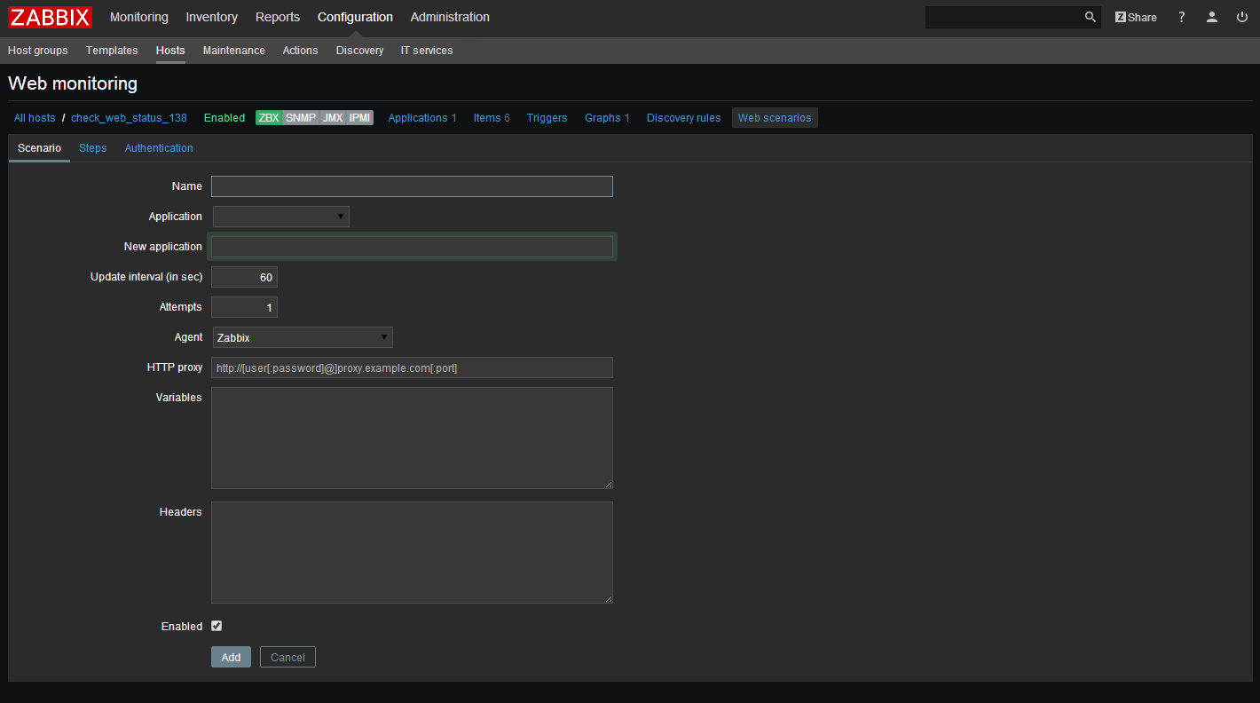 从 Zabbix2.2 开始,Web 场景和 Items,Triggers 等一样,是依附在 Hosts/Templates 的。这意味着 web 场景也可以创建一个模板,然后应用于多个主机。