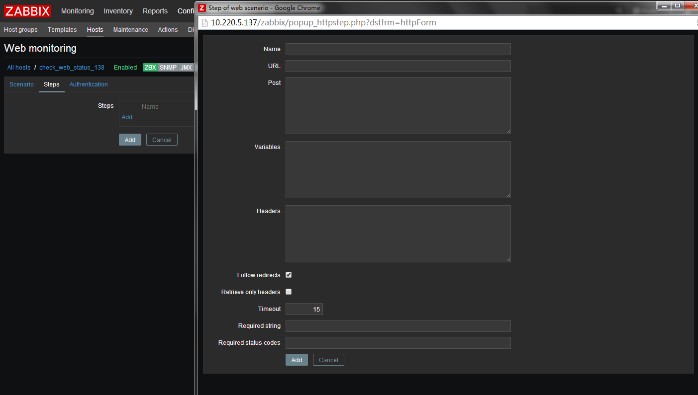 | 状态码 (Required status codes) | 可以设置预期的 HTTP 状态代码列表。 如果 Zabbix 获取的 HTTP 状态码不在列表中,该步骤将认为为失败。 如果为空,则不执行检查。 例如:200,201,210-299 Zabbix 2.2 开始,支持用户宏。 |