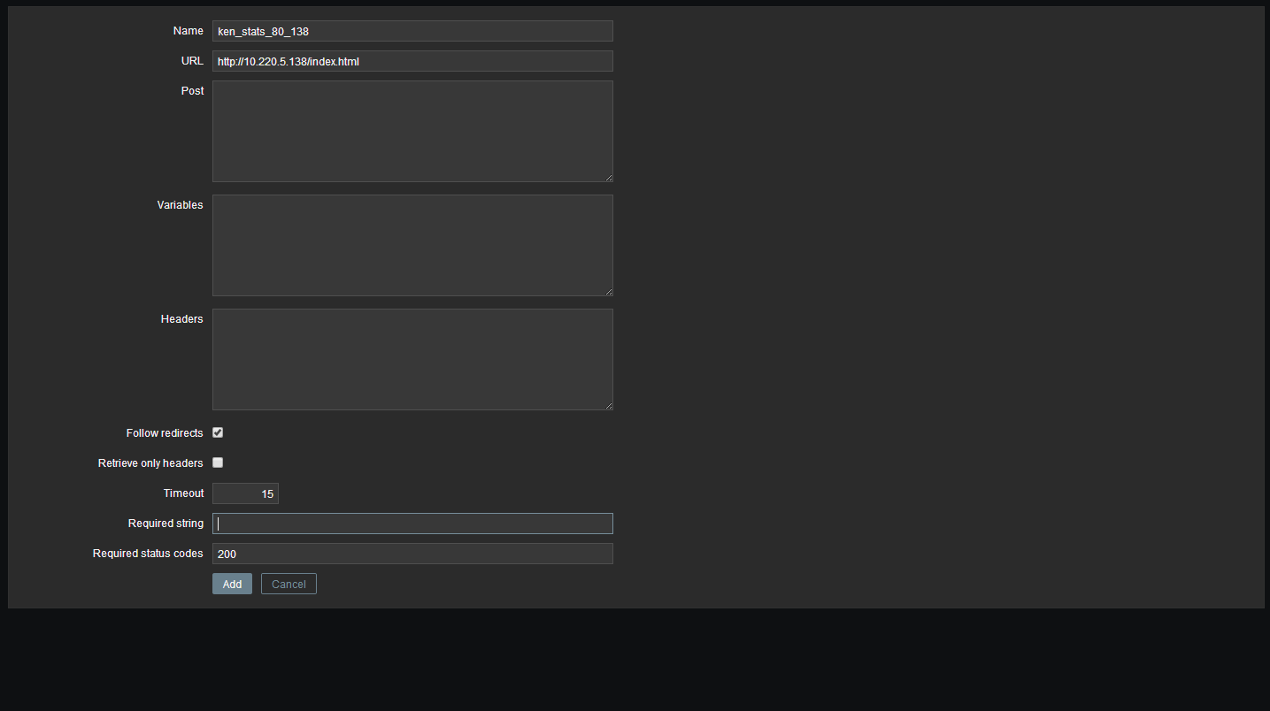| 仅检索标头 (Retrieve only headers) | 选中复选框,仅从 HTTP 响应中检索标题。 这将设置 CURLOPT NOBODY cURL 选项。 Zabbix 2.4 开始支持此选项。 |