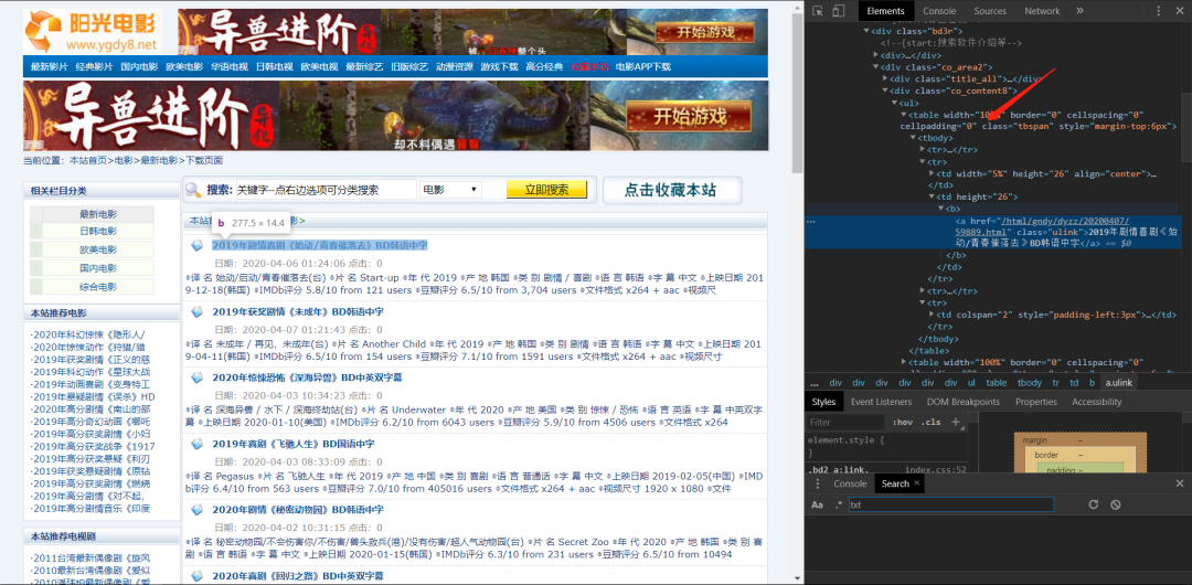 我们用正则表达式 来解析数据 我们右键检查可以看到我们要的网站在table里面的<tr>标签的<b>标签的<a>标签的href。