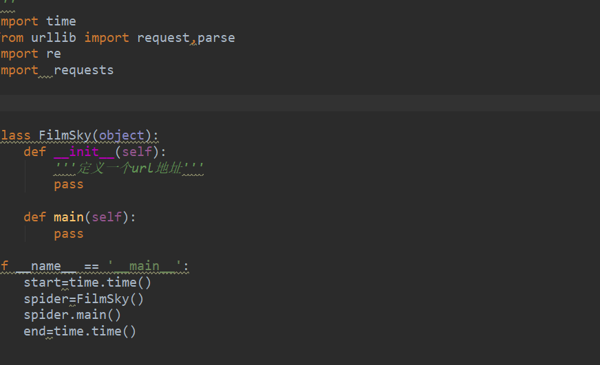 用封装方法去实现各个部分功能。首先要写一个框架 :构造一个类FilmSky 然后定义一个—init方法里继承(self),再定义一个主方法(main)。最后实现这个main方法。代码如下: