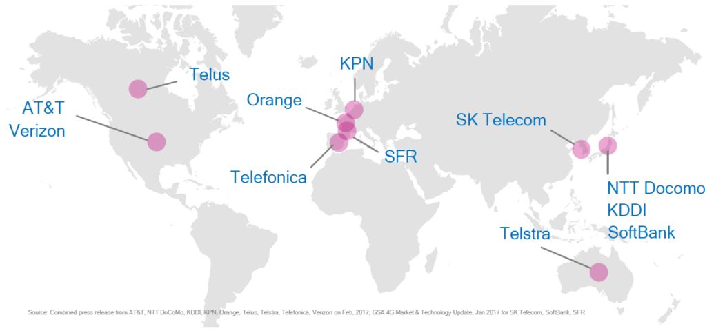 早在2017年年初,AT&T (美国和墨西哥)、KPN (荷兰)、 KDDI (日本)、NTT DOCOMO (日本)、Orange (欧洲、中东和非洲)、Telefonica (欧洲)、Telstra (澳大利亚)、TELUS (加拿大) 和Verizon (美国) 就联合宣布支持eMTC的全球部署。尤其是美国的AT&T和Verizon,都在2017年宣称部署了国家级的eMTC网络。