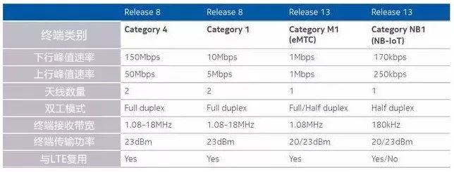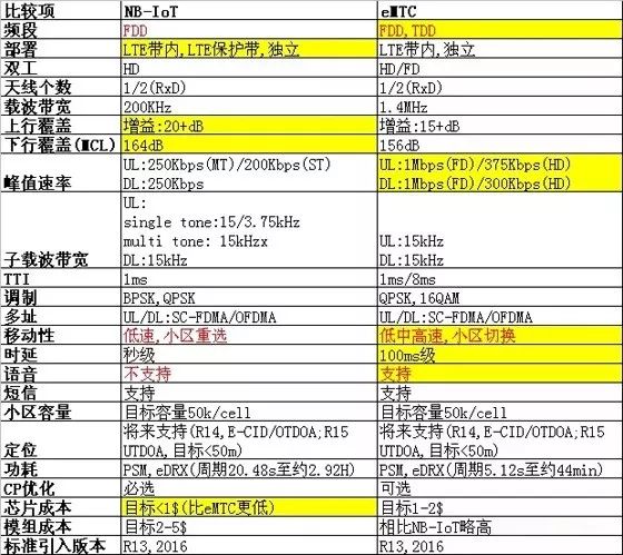 NB-IoT和eMTC参数对比