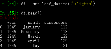 1 df = sns.load_dataset('flights') # 在线下载一个数据用于实验,在sns.load_dataset()函数里有很多的数据,想了解更多的可以到GitHub中找到源码,你就会很清楚了