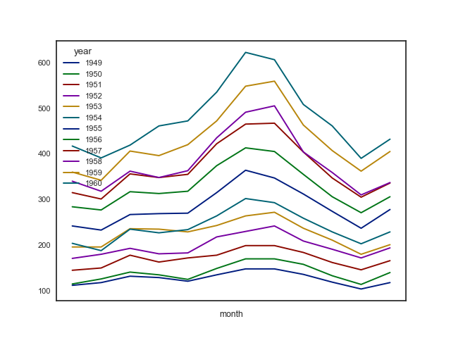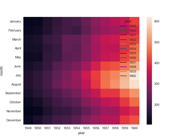 1 df = df.pivot(index='month',columns='year',values='passengers') # 生成一个透视表,得到一个以年、月为轴的二维数据表