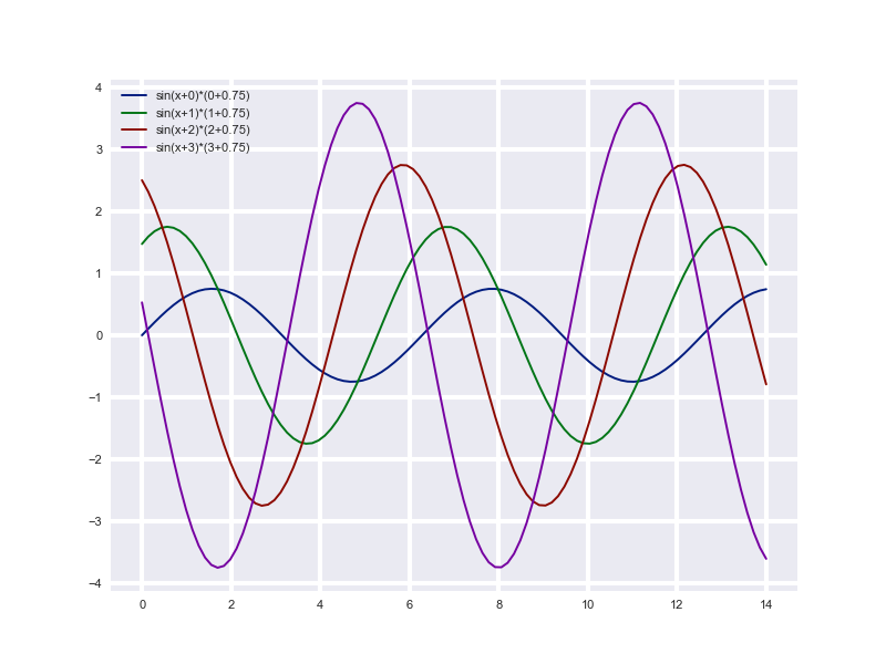 6 plt.plot(x,np.sin(x+i)*(i+0.75),label='sin(x+%s)*(%s+0.75)' % (i,i))