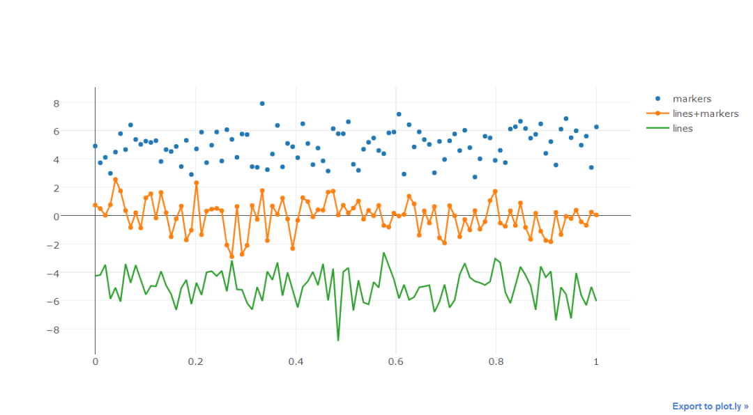 import numpy as npimport plotlyimport plotly.graph_objs as go'''创建仿真数据'''N = 100random_x = np.linspace(0, 1, N)random_y0 = np.random.randn(N)+5random_y1 = np.random.randn(N)random_y2 = np.random.randn(N)-5'''构造trace0'''trace0 = go.Scatter(x = random_x,y = random_y0,mode = 'markers',name = 'markers')'''构造trace1'''trace1 = go.Scatter(x = random_x,y = random_y1,mode = 'lines+markers',name = 'lines+markers')'''构造trace2'''trace2 = go.Scatter(x = random_x,y = random_y2,mode = 'lines',name = 'lines')'''将所有trace保存在列表中'''data = [trace0, trace1, trace2]'''启动绘图'''plotly.offline.init_notebook_mode()plotly.offline.iplot(data, filename='scatter-mode')