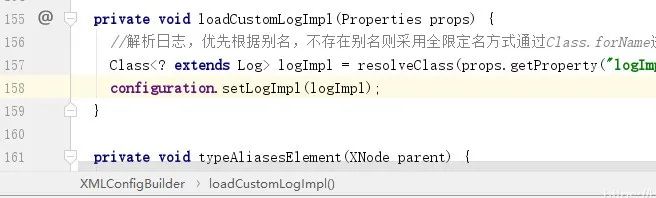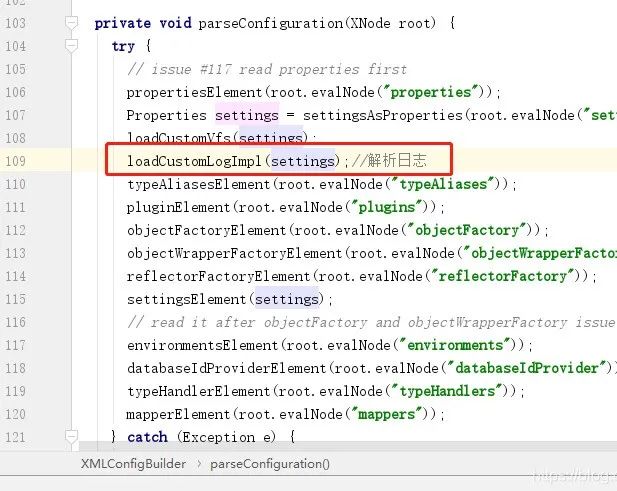 老规矩,我们还是先找到加载mybatis-config配置文件中的解析日志的源码: