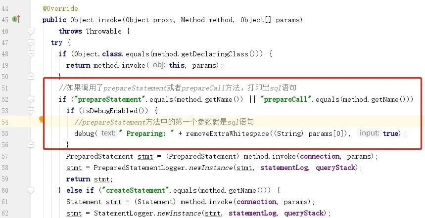 其他三个那很明显,分别是用来代理PreparedStatement,ResultSet,Statement这三个对象的。也就是说MyBatis中日志最终的打印是通过JDK动态代理来实现的,而且不同的执行过程分成了四个对象来分别负责对应的日志打印。