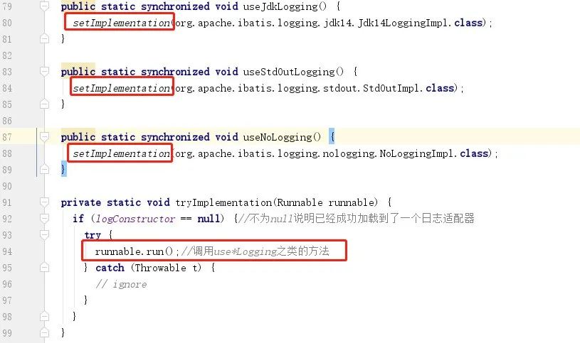 再看一下tryImplementation方法,如果logConstructor不为空,说明当前还没有加载到日志适配器,那就继续执行run()方法,也就是继续执行useXXXLogging方法,而所有的useXXXLogging方法都是调用了setImplementation方法。