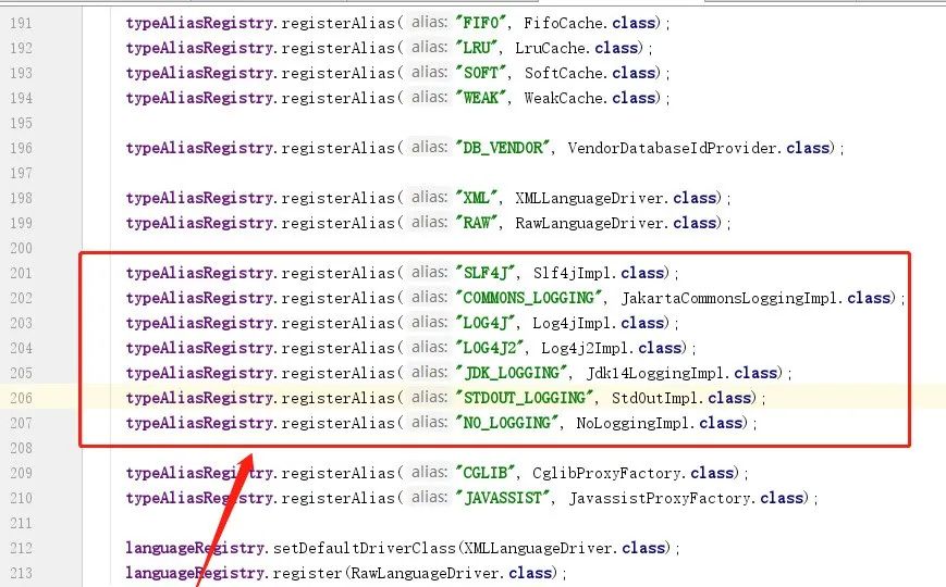 虽然别名都存在TypeAliasRegistry类里面,但是我们前面介绍MyBatis配置文件的时候,列出了TypeAliasRegistry类中默认初始化的别名,并没有看到日志相关类的别名,那么日志的别名又是在哪里配置的呢?我们打开Configuration类: