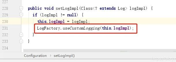 继续回到上面的Configuration里面,这里拿到我们配置的日志信息之后,会直接调用useCustomLogging方法,也就是绕过了上面的logConstructor == null这个判断,而直接调用了setImplementation方法,所以假如我们配置了日志信息,那么会覆盖初始化的日志适配器。