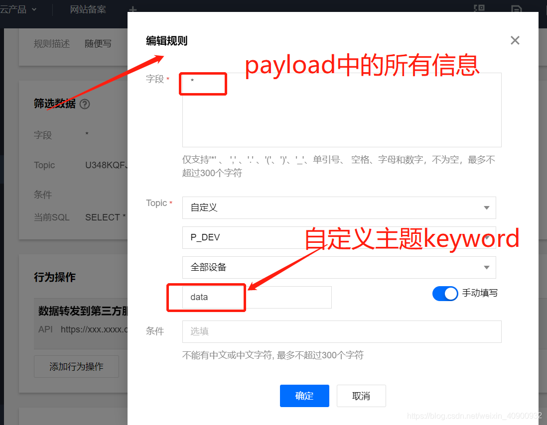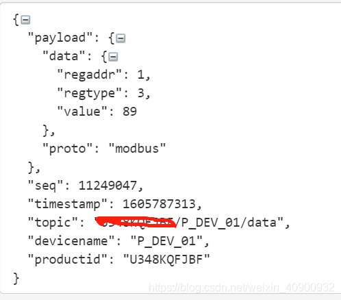 在触发转发行为时,规则引擎会对设备上报的 payload, 进行JSON 封装。