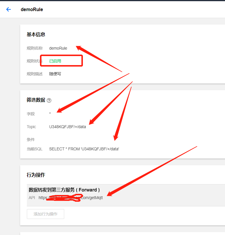 在这里,我们测试将设备发布的mqtt报文信息全部转发