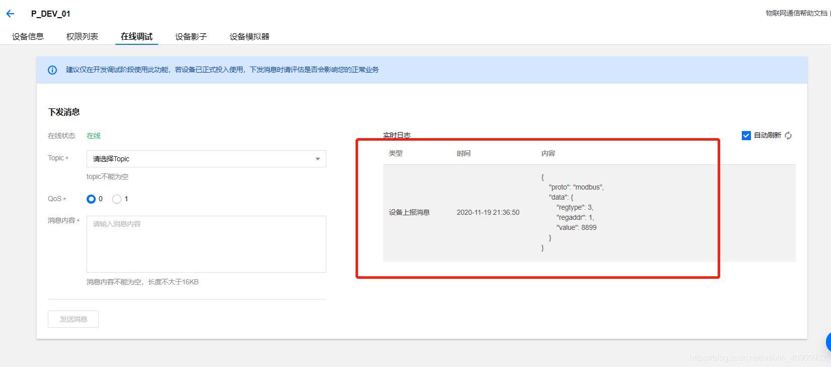 通过在线调试可以查看数据,设备将发布到腾讯云物联网服务器,通过在线调试可以查看数据,如下;