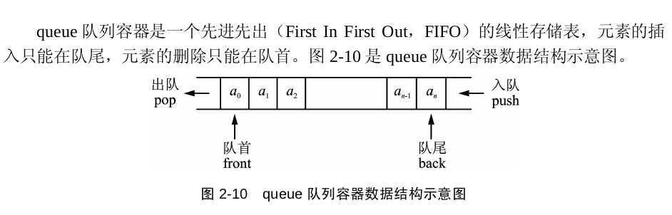 queue有入队push(插入)、出队pop(删除)、读取队首元素front、读取队尾元素back、empty,size这几种方法