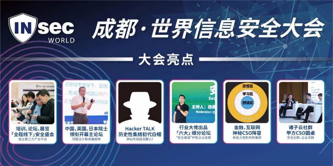 本年度信息安全界的盛会——INSEC WORLD成都·世界信息安全大会将于11月24至27日在中国西部国际博览城举行。本届大会以“新基建——安全为本”为主题,为期4天的大会将采用线下为主,内容包括2日高阶培训和2日主论坛、6大分论坛,以及高质量的信息安全技术线下展示。克服疫情等不利因素,本届大会总规模,演讲嘉宾层级、参会观众数量将比上届有显著提高。届时,由中外3大院士领衔的,近60位海内外演讲嘉宾倾情奉献,逾2,000位线下参会人士,近百家媒体全程报道。大会将为厂商搭建技术探讨、商务交流的高效面对面平台,在动荡的黑天鹅年底,温暖重现行业“见面的温度”。