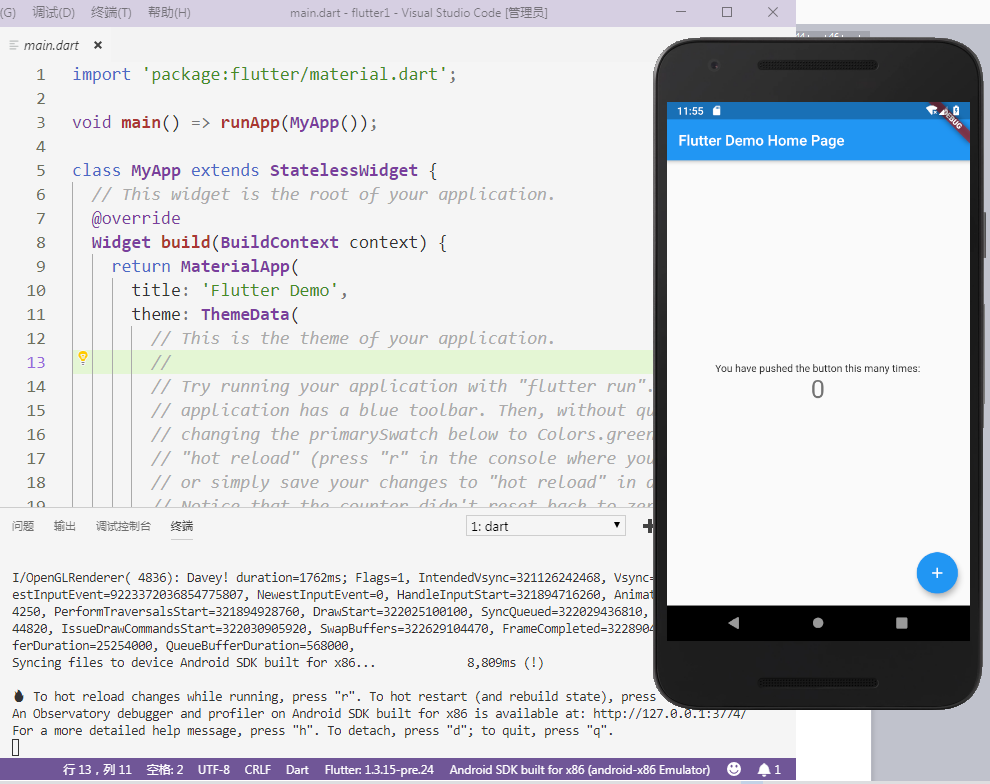 如果显示已有安卓设备连接到当前电脑,则运行 flutter run 命令,即可把项目以 debug 调试模式运行于安卓设备之上