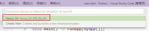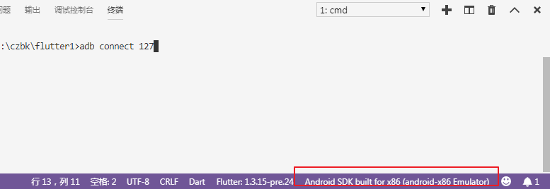 如果是用模拟器,需要安装启动模板器后,在 VSC 的控制终端上输入 adb connect 命令连接。比如:夜神为 adb connect 127.0.0.1:62001。(经测试部分模拟器会报错 Dart VM: SSE2 is required,如 mumu 模拟器。)正常链接模拟器后可查看右下角状态。推荐使用 android studio 模拟器(VSC 可自动识别)。