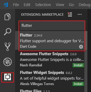 在搜索框输入 flutter , 在搜索结果列表中选择 ‘Flutter’和‘Dart’, 然后点击 Install