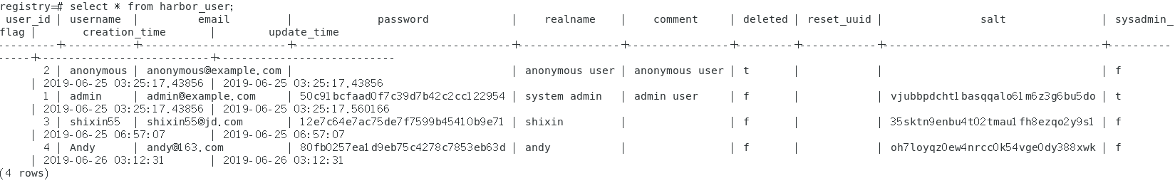 select * from harbor_user; #查询表数据