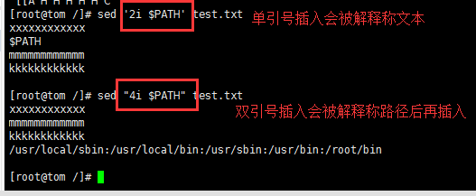 [root@tom /]# sed -i "3a qq\nwww\neee\nrrr\nttt\nyyy\nuuu" test.txt # -i 代表写入原文件, \n 代表换行,一定不能忘记写 \n 不然不会起作用