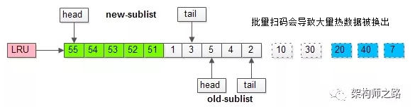 如此一来,所有的数据页都会被加载到新生代的头部,但只会访问一次,真正的热数据被大量换出。