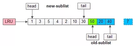 如上图,假如管理缓冲池的LRU长度为10,缓冲了页号为1,3,5…,40,7的页。
