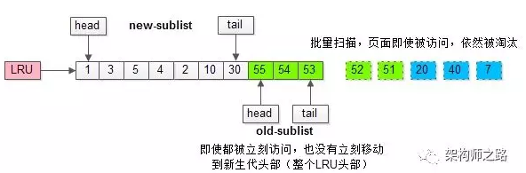 页被访问,且在老生代停留时间超过配置阈值的,才进入新生代,以解决批量数据访问,大量热数据淘汰的问题