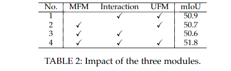 如图1所示,本文的网络由三个模块组成。如图2所示,我们评估了MiniFusion模块(MFM),多尺度交互模块(Interaction)和up-融合模块(UFM)的一些设计选择。虽然所提出的方法达到了51.8%的mIoU(第4行),但将在将它们分别融合到第一行的特征空间之前,分别评估了处理每种模态的影响。为了保持参数数量相同,使用3×3卷积来处理输入的多模态图像,而不是在Mini Fusion模块中分别处理每个模态。在这种情况下,精度下降了0.9%(行1)。这显示了在开始时分别处理每个模态的好处。在图1中,在三个路径之间建立了连接,如果删除了从上到下的交互,则准确性降低了1.1%(第2行)。这证明了允许多尺度特征之间进行交互的好处。如果仅通过卷积层调整多分辨率特征的大小,对其进行级联和处理,而不使用Up Fusion模块,则精度会降低1.2%(第3行)。