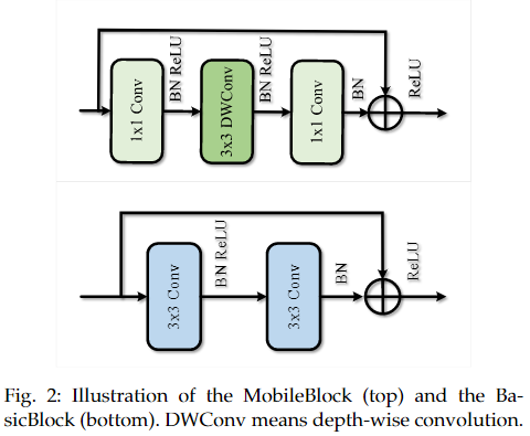 每条路径的计算方式不同,使用两个基本组件,即 MobileBlock 和 BasicBlock实现。MobileBlock利用深度可分离卷积,因此参数较少,但其学习能力也有限。BasicBlock的提取特征的能力更强,但代价也更高。MobilBlock和BasicBlock如图2所示。