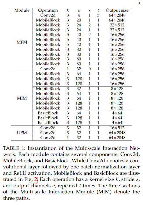 融合模块之后,数据通过三个路径进行处理,其中每个路径对应于一个不同的比例,如图1所示。从上到下,使用平均池化层将特征图的分辨率降低两倍,并相应地增加了感受野。对于top路径,使用最高分辨率,由于处理高分辨率特征图非常耗费计算量,因此仅使用三个MobileBlock,如表1中所示。底部路径具有最大的感受野和最低的分辨率,可以提供更多抽象的语义信息,因此,底部路径使用三个BasicBlocks。中间路径是顶部和底部路径之间的折衷,由五个MobileBlock组成。