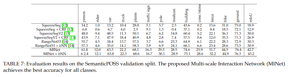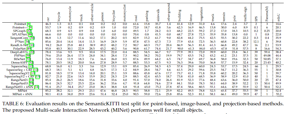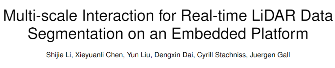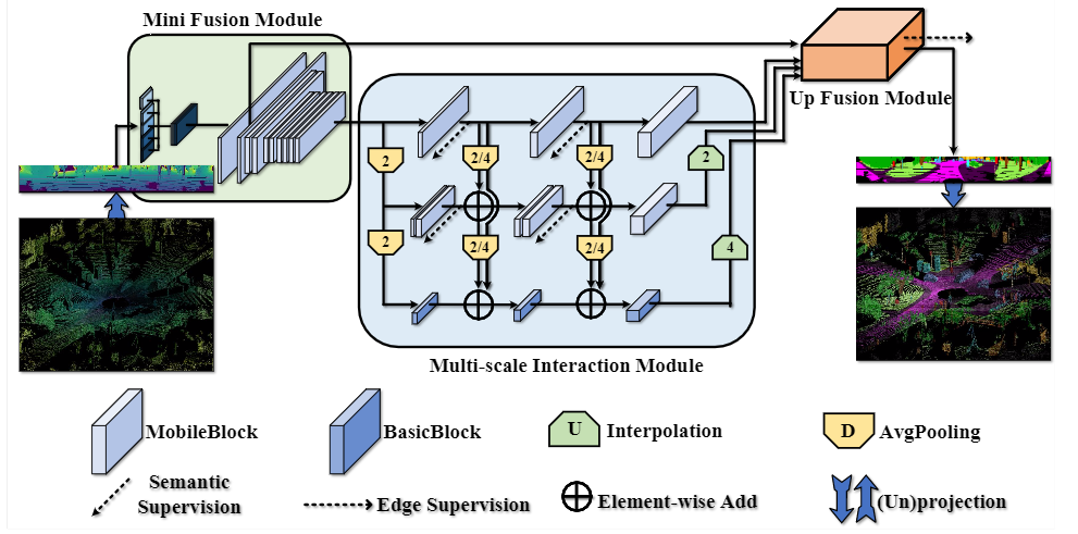 因此,在本文的工作中提出了一种新颖的基于投影的方法,该方法可以实现高精度,并且在嵌入式平台上比LiDAR传感器具有更高的帧速率。具体而言有三大贡献:首先,提出了一种非常有效的多尺度体系结构,该体系结构以最佳方式平衡了不同尺度上的计算资源。因此,将网络称为多尺度交互网络(MINet)。其次,提供了额外的监督损失函数,从而在不增加运行时间或推理内存消耗的情况下提高了准确性。第三,在融合之前,首先独立地处理不同的模态,这也提高了准确性。
