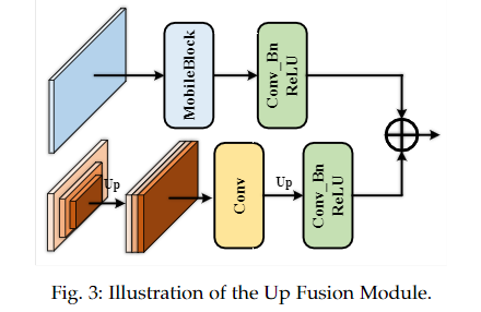 为了获得投影的输入图像的每个像素的语义标签,图3所示的Up Fusion模块将不同比例的特征进行组合,并将其上采样到输入分辨率。另外,Mini Fusion Module的第一个MobileBlock之后的特征用于恢复详细的空间信息,如图1所示。图3的下半部分输入为三个不同路径的特征图,这些路径首先被调整为相同的大小,并串联在一起,并通过1×1卷积融合。然后将融合后的特征图上采样到原始分辨率,并通过包括3x3卷积,批处理归一化和ReLU激活函数的卷积块进行处理。上半部分输入为Mini Fusion Module中已经具有原始分辨率的特征图。它们由一个MobileBlock和卷积块处理。最后,将两个模块的处理后的特征添加在一起。尽管原始特征图的空间信息已经有助于锐化线段边界,但由于上采样的缘故,这可能会变得模糊,但对线段边界添加额外的监督会强化这种锐化增强的效果。