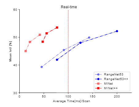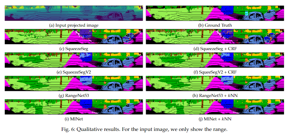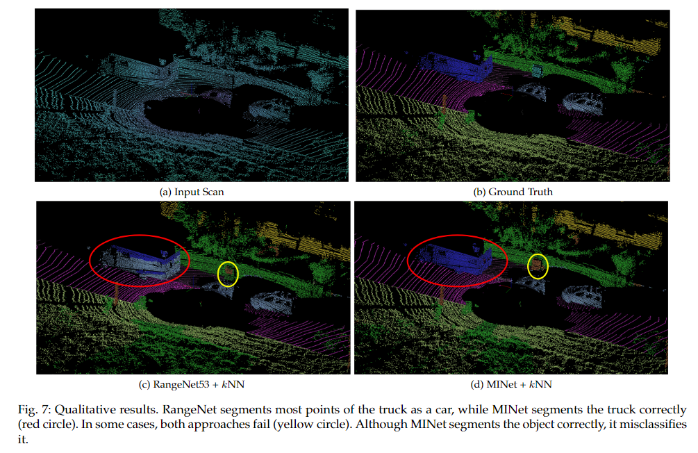 最后,将本文的方法与RangeNet在嵌入式平台上进行比较。使用了一个Jetson AGX,这是一个用于嵌入式系统的人工智能模块,因为它们被用于自主驾驶,并通过TensorRT优化所有方法。结果显示在图8中,并在图8中可视化。由于输入分辨率可以降低以减少运行时间,实验报告了三种不同输入分辨率的结果。可以看到,在每个分辨率下,无论是否进行后处理,多尺度交互网络都优于RangeNet53。而且,它的速度比RangeNet53快得多,即使在全分辨率和后处理的情况下,多尺度交互网络也能实时运行,因为激光雷达的扫描频率是10Hz。与Tab. 此外,后处理是在点云上进行的,它不能从降低投影图像的分辨率中获益。多尺度交互网络在不进行后处理的情况下比RangeNet53快4倍左右,而在进行后处理的情况下则快2倍左右。